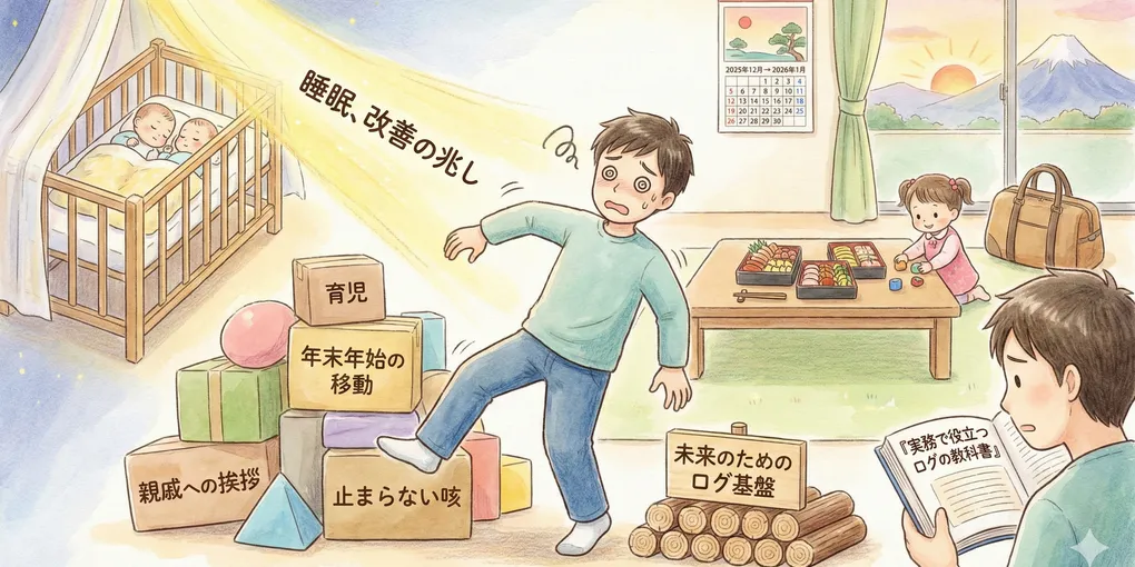 2025年の締めくくりから2026年の幕開けまで、家族行事を完走しながら「攻め」のインプットを再開した1週間だった。特に『実務で役立つ ログの教科書』に着手し、復帰後のフロントエンド基盤・運用を見据えた概念整理ができたのは大きい。また、双子の睡眠時間に改善の兆しが見え、生活リズム再構築への光が差してきた。